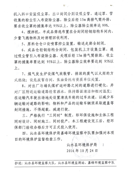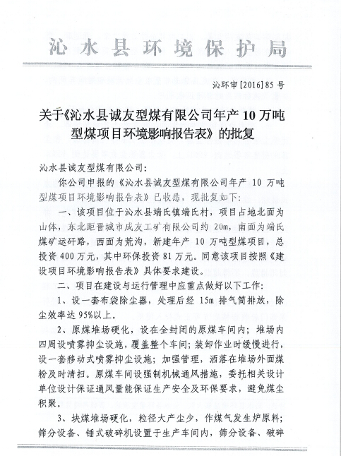 2016年10月24日,沁水縣環(huán)境保護(hù)局以沁環(huán)審[2016]85號文對該項目環(huán)境影響報告表進(jìn)行了批復(fù)。