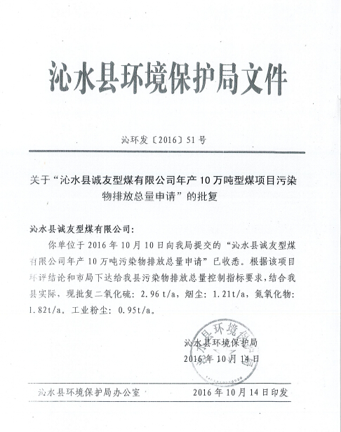根據(jù)《山西省環(huán)境保護(hù)廳建設(shè)項目主要污染物排放總量核定辦法》晉環(huán)發(fā)[2015]25號文件,總量核定指標(biāo)不包括無組織排放量,由以上分析知本項目總量控制指標(biāo)為:粉塵0.95t/a,煙塵1.21t/a,SO2 2.96t/a,NOX 1.82t/a。2016年10月14日沁水縣環(huán)境保護(hù)局以沁環(huán)發(fā)[2016]51號文對該項目總量進(jìn)行了批復(fù)。本項目運營期落實環(huán)評要求后可以滿足沁水縣環(huán)境保護(hù)局對本公司下達(dá)的總量控制指標(biāo)。