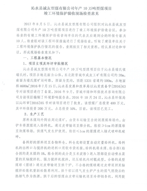 2017年8月5日,沁水縣誠友型煤有限公司組織對沁水縣誠友型煤有限公司年產(chǎn)10萬噸型煤項目進(jìn)行了竣工環(huán)境保護(hù)驗收會議,參加檢查的有竣工環(huán)境保護(hù)驗收咨詢單位的代表及應(yīng)邀到會的環(huán)保專家共10人,檢查組對該工程環(huán)保措施進(jìn)行了現(xiàn)場檢查,聽取了建設(shè)單位關(guān)于工程環(huán)境保護(hù)執(zhí)行情況的報告,經(jīng)認(rèn)真討論和審議后,提出以下要求及建議: